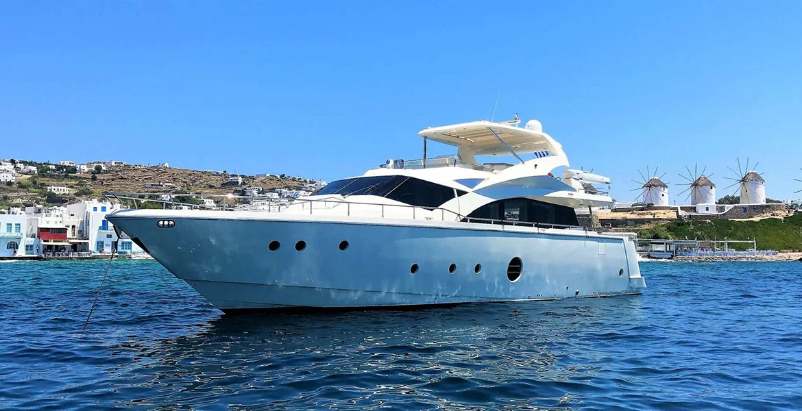 QUESTA E VITA is a magnificent Aicon 77 Fly, designed for those seeking the ultimate luxury yacht charter in Greece. At 77 feet, this elegant motor yacht boasts sleek lines, an innovative layout, and a combination of performance and comfort. With a cruising speed of 22 knots and a maximum speed of 30 knots, she ensures smooth and stylish sailing across the Aegean and Ionian Seas. Stabilizers at anchor and underway provide unparalleled stability, making every moment on board relaxing. The experienced crew of four delivers five-star service, ensuring an unforgettable charter yacht experience tailored to guests’ desires.